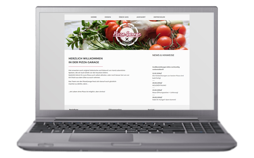 Für Daniele Campanella, Inhaber des Restaurants Pizzagarage in Schwieberdingen, habe ich eine Website nach einer bereits fertigen, aber rein visuellen Vorlage umgesetzt. Die Seite zeigt Neuigkeiten, die Speisekarte und Bestellinformationen. Neben der Umsetzung habe ich auch die Hosting-Einrichtung und den Umzug der Seite übernommen. Als Basis diente das CMS Wordpress (WP).