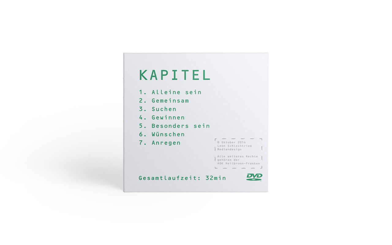 Die AOK Heilbronn-Franken beauftragte mich, eine DVD zum 20. Forum der Selbsthilfegruppen Heilbronn zu machen. Ich bekam die Rohdaten des Filmmaterials und machte mich anschließend an den Schnitt, die Nachbearbeitung, Einblendungen, Kapitel, das DVD-Menü und Printsachen.