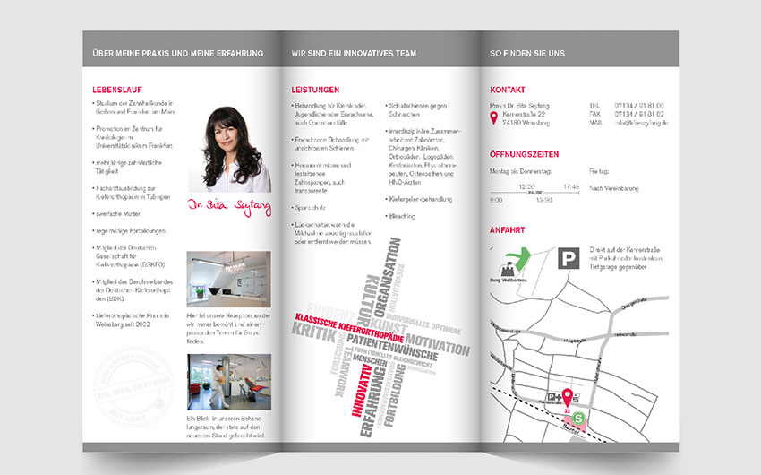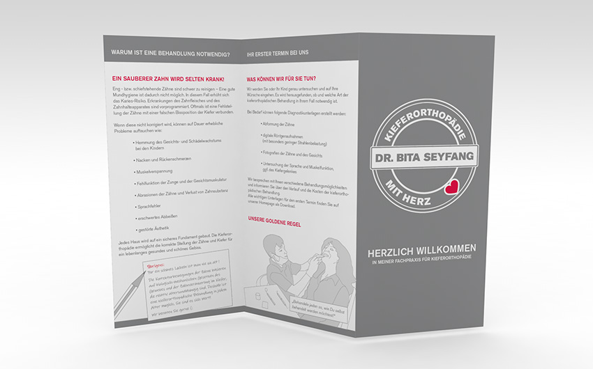Für die Kieferorthopädiepraxis Seyfang in Weinsberg habe ich das komplette Corporate Design neugestaltet. Das ging vom Logo, über sämtliche Printprodukte und Aufkleber bis hin zur Überarbeitung der Website.